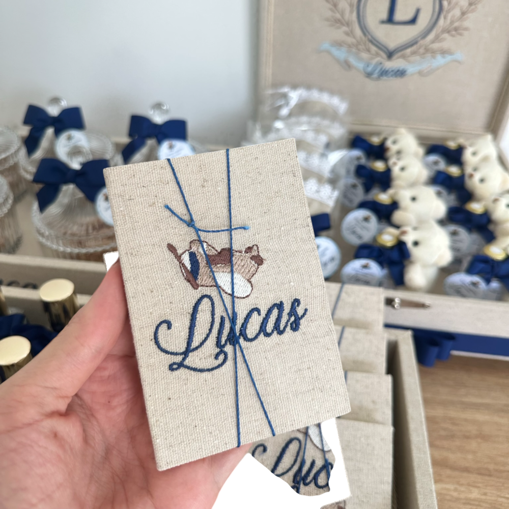 - 10 Livrinhos Minuto Sabedoria, revestidos em linho com bordado, laço e tag