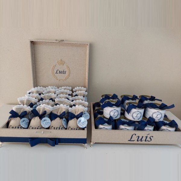 Kit Lembranças de Nascimento Sachê Bordado e Latinhas