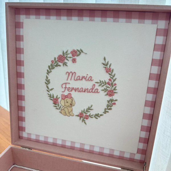 Caixa 30x30 com dobradiça , fecho, pés de metal, revestida em linho com bordado interno na tampa