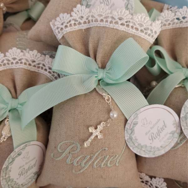 - Mini terço: Cada sachê acompanha um mini terço, adicionando um toque espiritual e elegante ao produto.